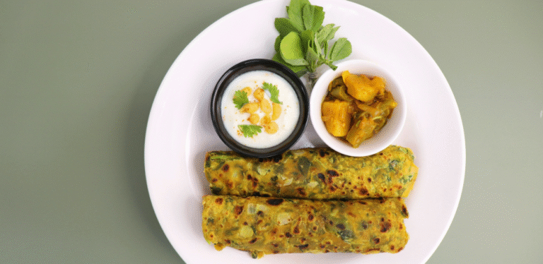 Methi Paratha are Indian flatbreads made with whole wheat flour, spices and fenugreek leaves aka methi leaves. These healthy, delicious & flavorful parathas are iron rich & make for a great breakfast or any time meal. “Methi” is a Hindi word for “fenugreek and “Paratha” is a word for “flatbreads”. So methi paratha are simply flatbreads with fenugreek leaves in them. While methi mean both fenugreek leaves and seeds, here in this recipe it is the leaves.